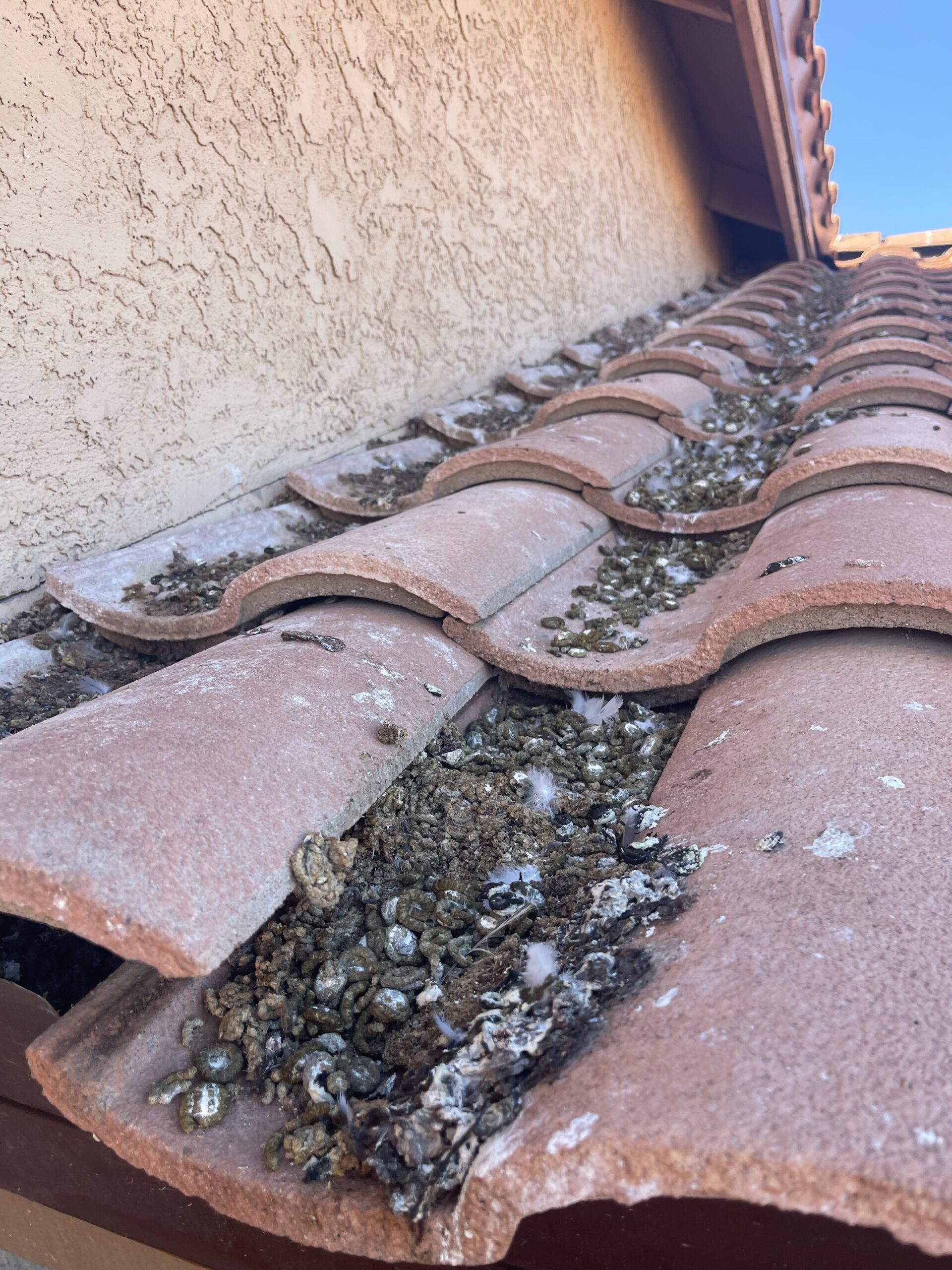 Tile roofs with eaves and overhangs are a pigeon magnet. They’ll nest in any gap, crevice, or recessed area they can find — including architectural pop-outs, covered entryways, and patio covers. We install spikes, wire, and barricades to make these areas inaccessible.